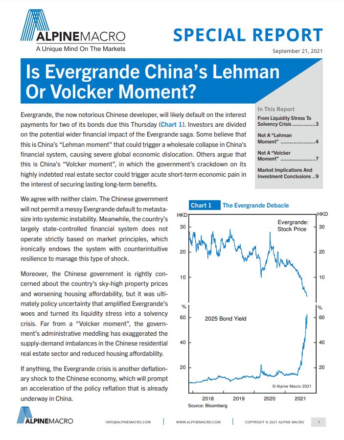 Evergrande, the now notorious Chinese developer, will likely default on the interest payments for two of its bonds due later this week. This represents neither a “Lehman moment” nor a “Volcker moment” for China’s financial system. It is potentially another deflationary shock for the Chinese economy, which will only accelerate the deployment of China’s policy reflation that is already underway.